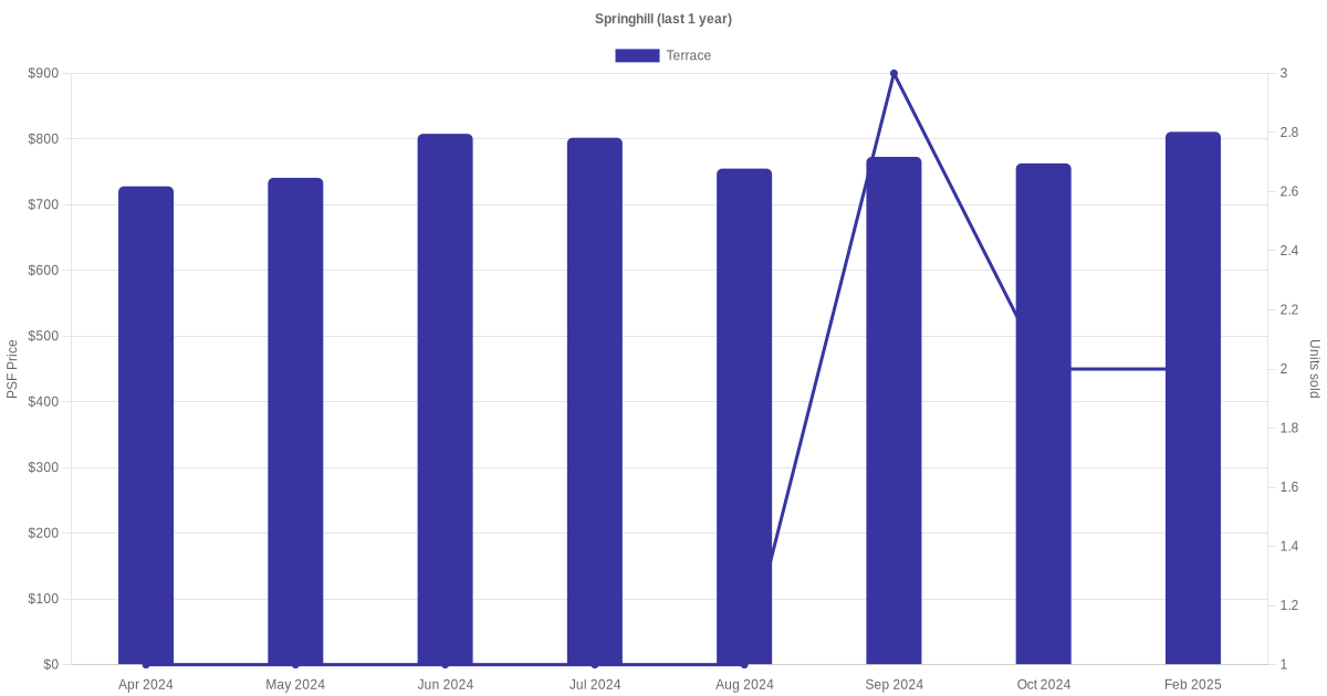 There were a total of 23 sales transactions for Springhill in the last 3 years, with the latest one recorded in Jul 2025. Disclaimer : our transactions data below does not include block numbers as the data is not available.