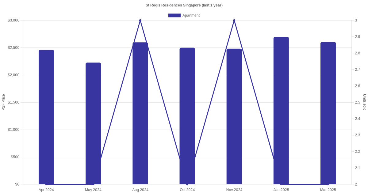 There were a total of 30 sales transactions for St Regis Residences Singapore in the last 3 years, with the latest one recorded in Nov 2025. Disclaimer : our transactions data below does not include block numbers as the data is not available.