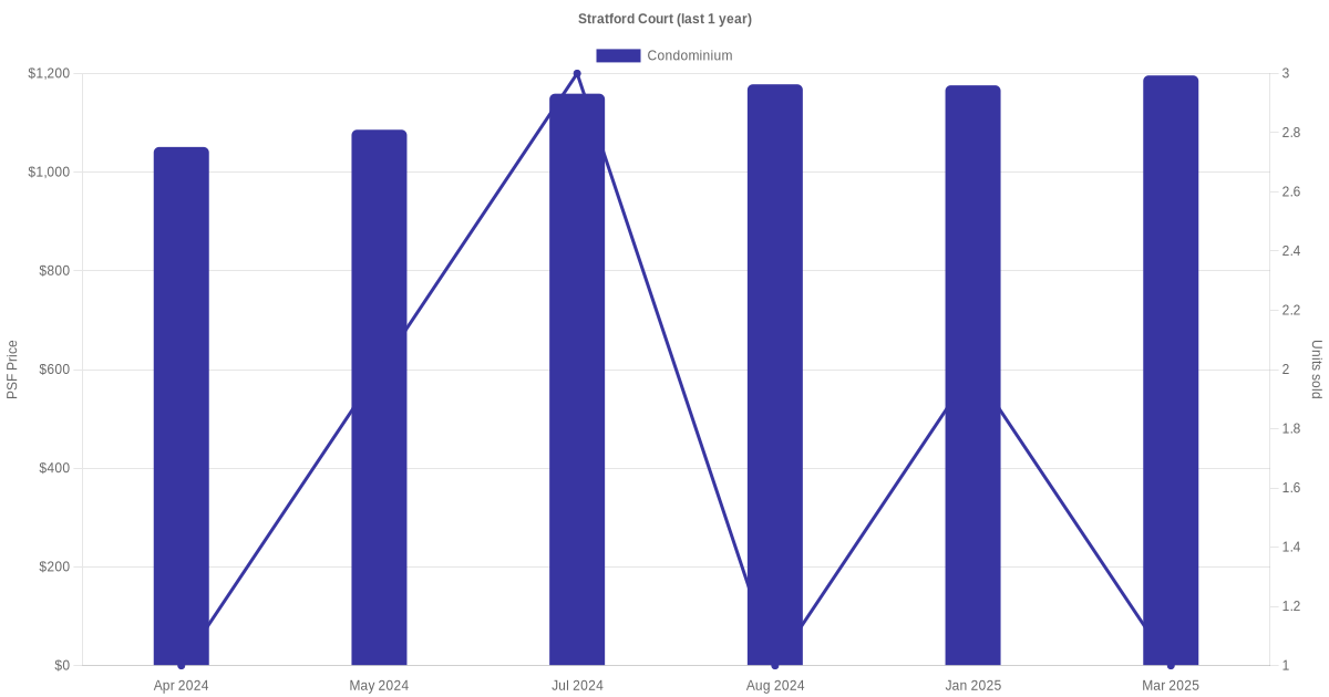 The graph below shows the average monthly transacted sale price for each of the condominium units for Stratford Court in the last 3 years. This is based on the transactional data collated for Stratford Court for the selected period.