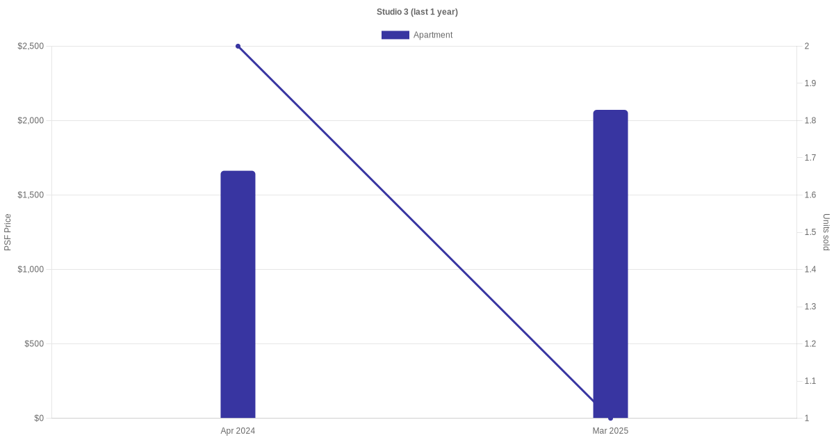 There were a total of 4 sales transactions for Studio 3 in the last 3 years, with the latest one recorded in Mar 2025. Disclaimer : our transactions data below does not include block numbers as the data is not available.