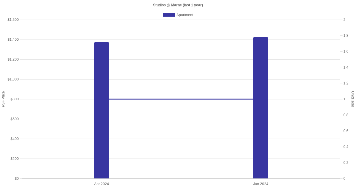 There were a total of 6 sales transactions for Studios @ Marne in the last 3 years, with the latest one recorded in Jun 2024. Disclaimer : our transactions data below does not include block numbers as the data is not available.