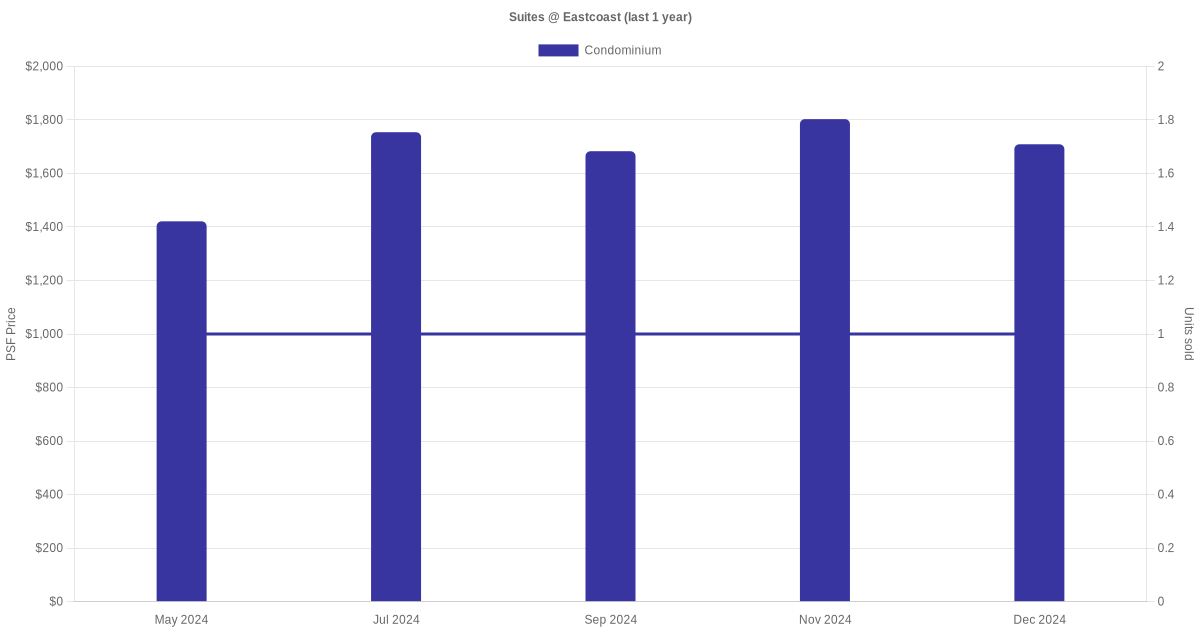There were a total of 17 sales transactions for Suites @ Eastcoast in the last 3 years, with the latest one recorded in Dec 2025. Disclaimer : our transactions data below does not include block numbers as the data is not available.