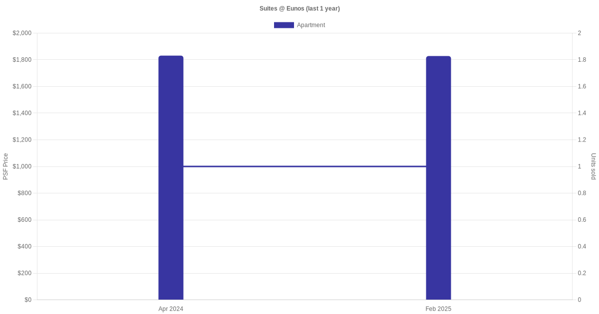There were a total of 5 sales transactions for Suites @ Eunos in the last 3 years, with the latest one recorded in Apr 2025. Disclaimer : our transactions data below does not include block numbers as the data is not available.