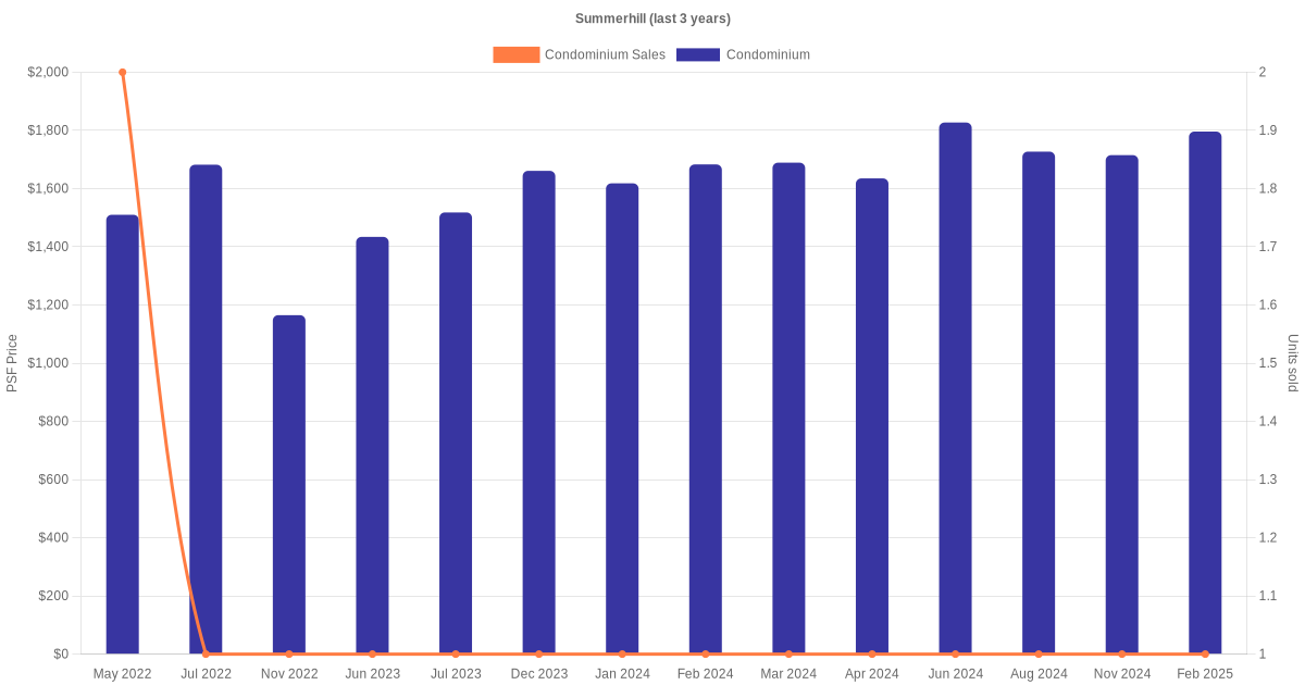 There were a total of 14 sales transactions for Summerhill in the last 3 years, with the latest one recorded in Jul 2025. Disclaimer : our transactions data below does not include block numbers as the data is not available.