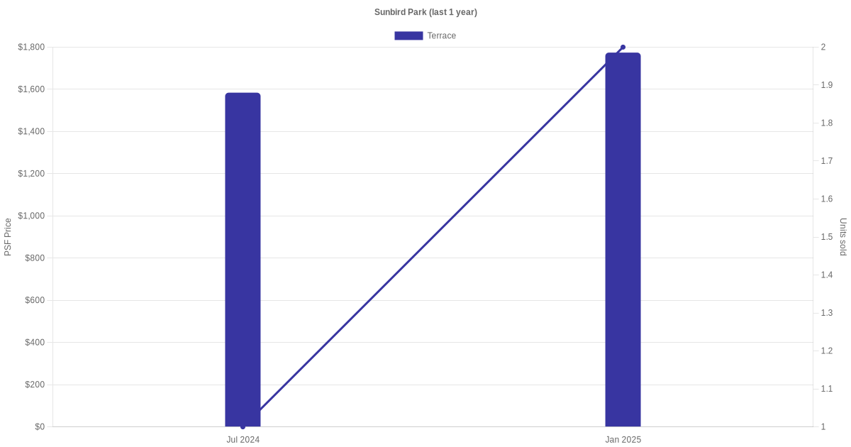 The graph below shows the average monthly transacted sale price for each of the terrace units for Sunbird Park in the last 3 years. This is based on the transactional data collated for Sunbird Park for the selected period.