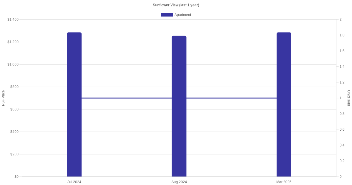 There were a total of 6 sales transactions for Sunflower View in the last 3 years, with the latest one recorded in Jul 2025. Disclaimer : our transactions data below does not include block numbers as the data is not available.