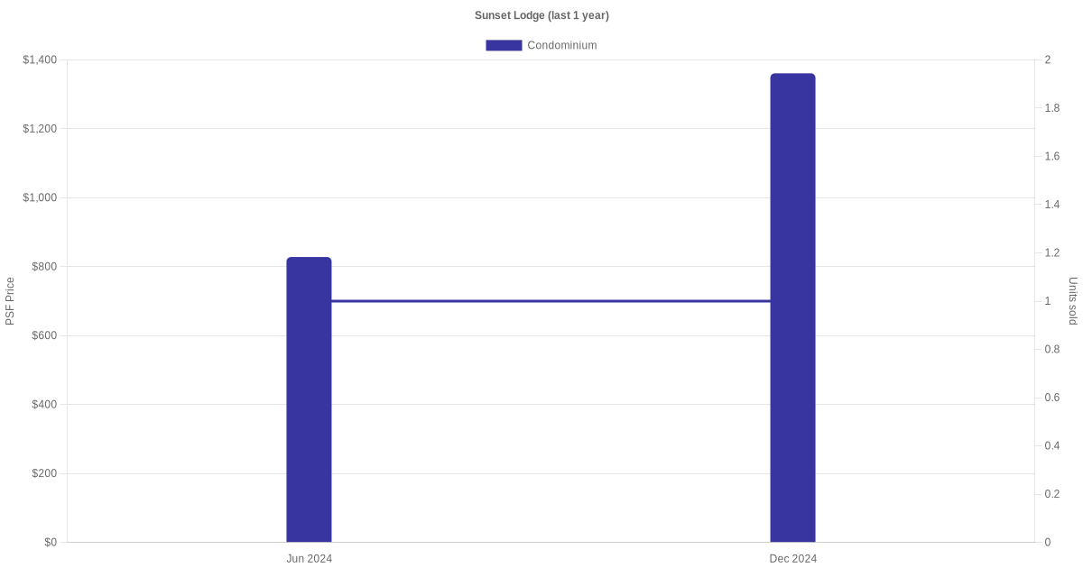 There were a total of 2 sales transactions for Sunset Lodge in the last 3 years, with the latest one recorded in Dec 2024. Disclaimer : our transactions data below does not include block numbers as the data is not available.