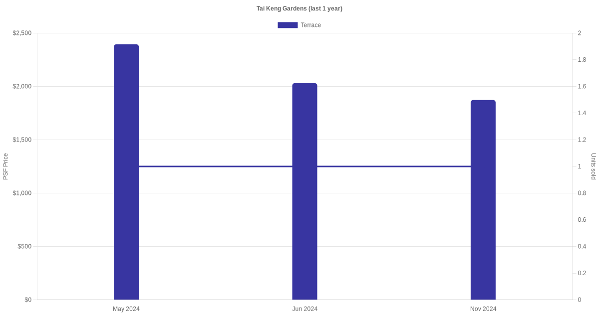 The graph below shows the average monthly transacted sale price for each of the semi-detached and terrace units for Tai Keng Gardens in the last 3 years. This is based on the transactional data collated for Tai Keng Gardens for the selected period.