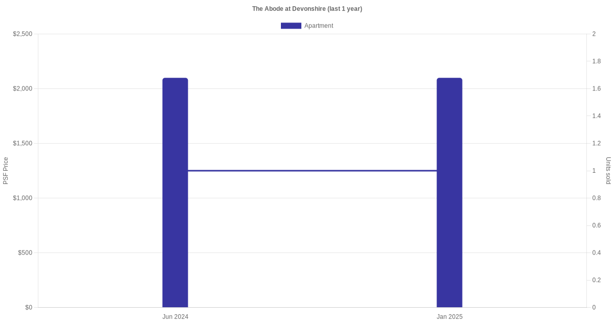 There were a total of 5 sales transactions for The Abode at Devonshire in the last 3 years, with the latest one recorded in Dec 2025. Disclaimer : our transactions data below does not include block numbers as the data is not available.