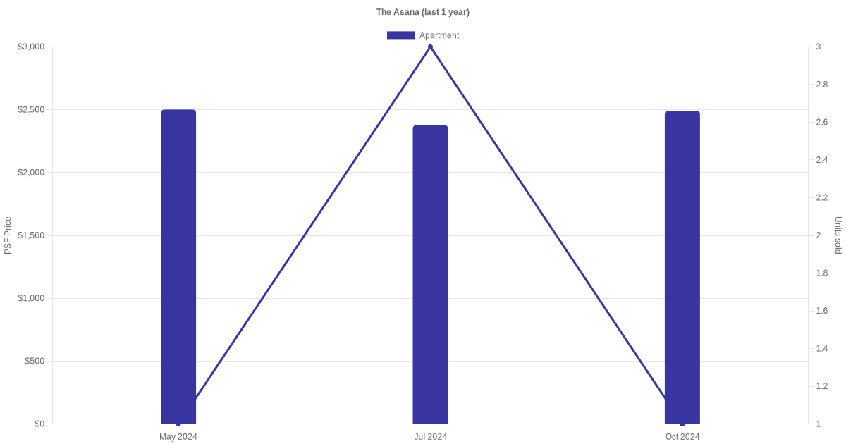 There were a total of 9 sales transactions for The Asana in the last 3 years, with the latest one recorded in Oct 2024. Disclaimer : our transactions data below does not include block numbers as the data is not available.