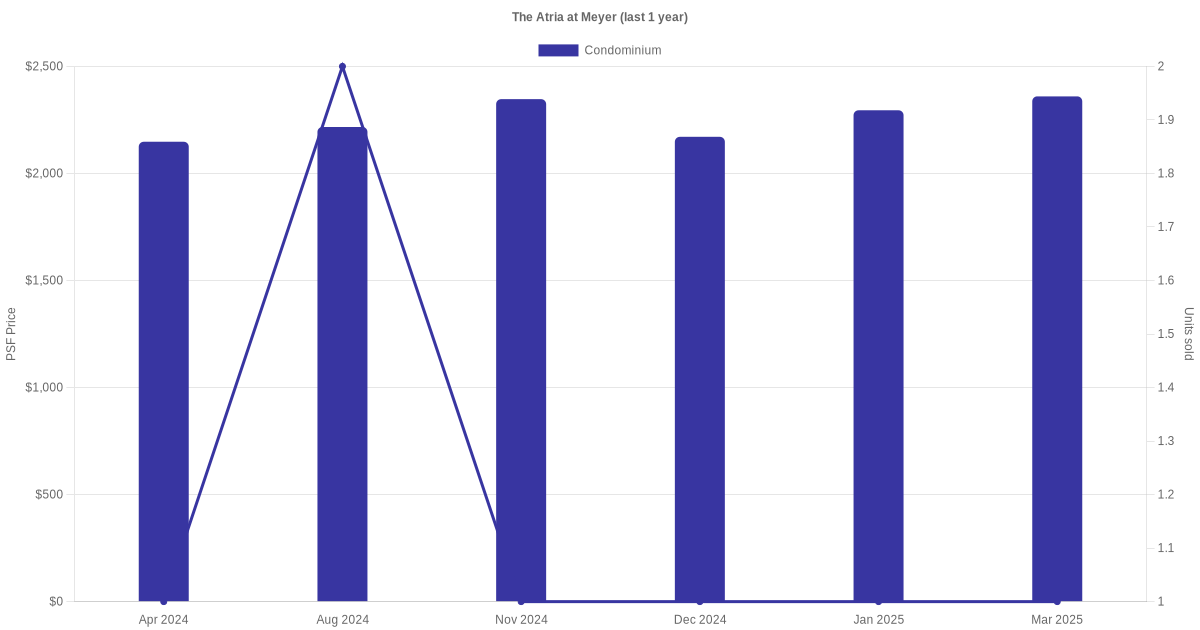 There were a total of 15 sales transactions for The Atria at Meyer in the last 3 years, with the latest one recorded in Nov 2025. Disclaimer : our transactions data below does not include block numbers as the data is not available.