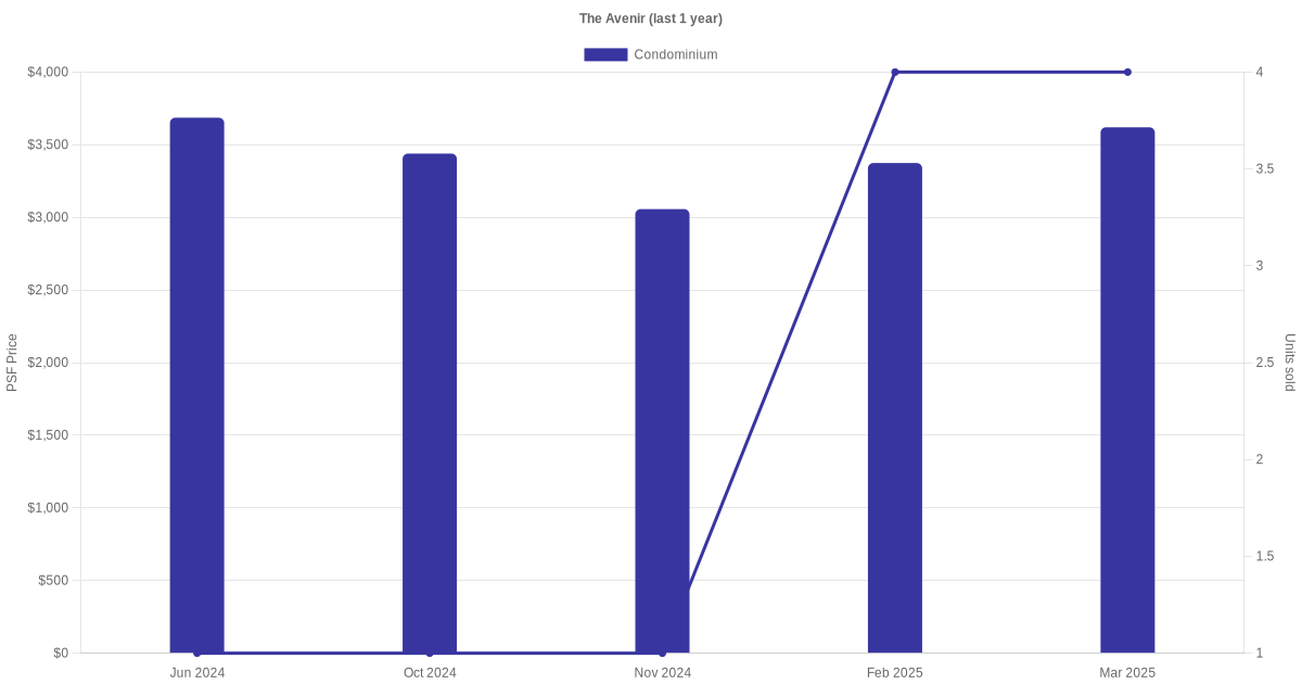 There were a total of 59 sales transactions for The Avenir in the last 3 years, with the latest one recorded in Nov 2025. Disclaimer : our transactions data below does not include block numbers as the data is not available. If you would like to see a list of blocks / addresses associated with The Avenir, please click here.