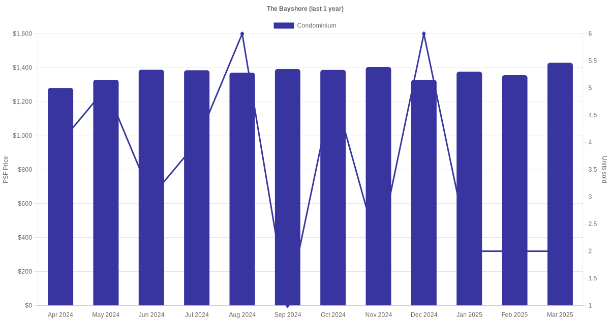 The graph below shows the average monthly transacted sale price for each of the condominium units for The Bayshore in the last 3 years. This is based on the transactional data collated for The Bayshore for the selected period.