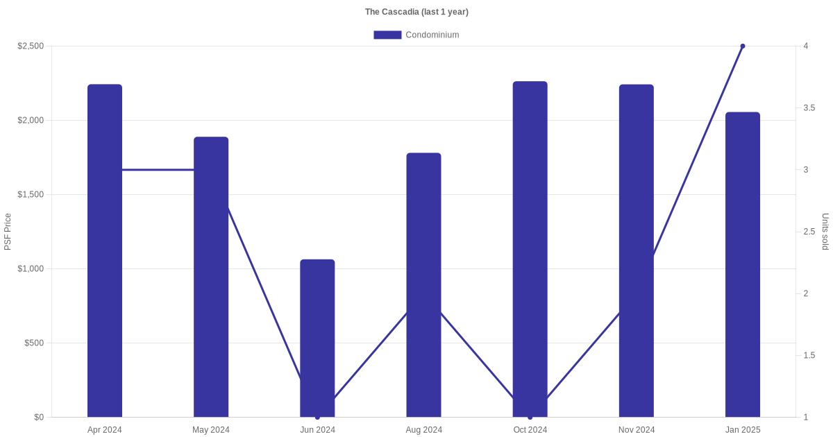 There were a total of 49 sales transactions for The Cascadia in the last 3 years, with the latest one recorded in Nov 2025. Disclaimer : our transactions data below does not include block numbers as the data is not available. If you would like to see a list of blocks / addresses associated with The Cascadia, please click here.