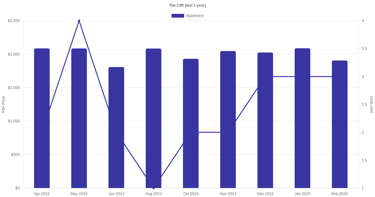 The graph below shows the average monthly transacted sale price for each of the apartment units for The Clift in the last 3 years. This is based on the transactional data collated for The Clift for the selected period.
