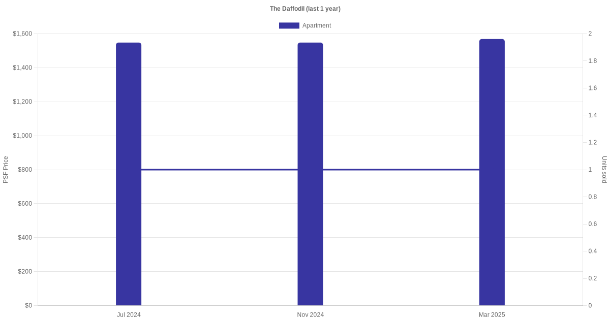 There were a total of 7 sales transactions for The Daffodil in the last 3 years, with the latest one recorded in Oct 2025. Disclaimer : our transactions data below does not include block numbers as the data is not available.