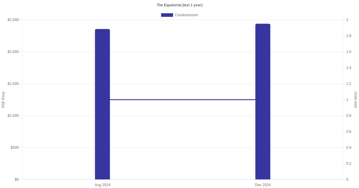 There were a total of 3 sales transactions for The Equatorial in the last 3 years, with the latest one recorded in Aug 2025. Disclaimer : our transactions data below does not include block numbers as the data is not available.
