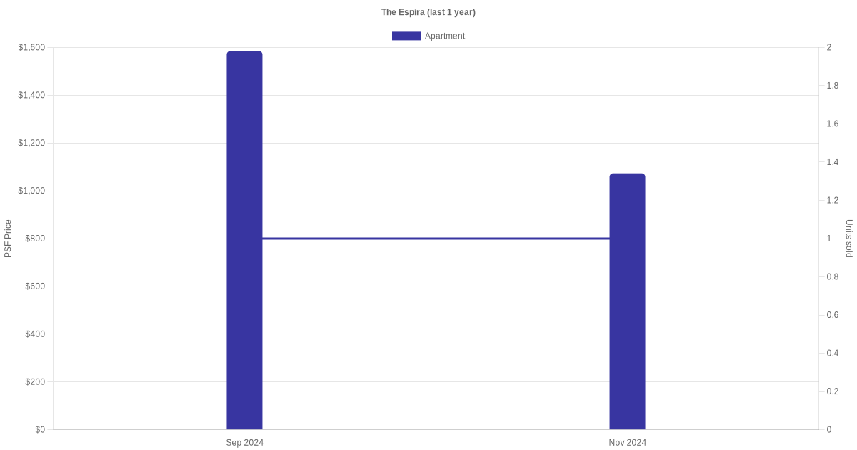 There were a total of 5 sales transactions for The Espira in the last 3 years, with the latest one recorded in Mar 2025. Disclaimer : our transactions data below does not include block numbers as the data is not available.