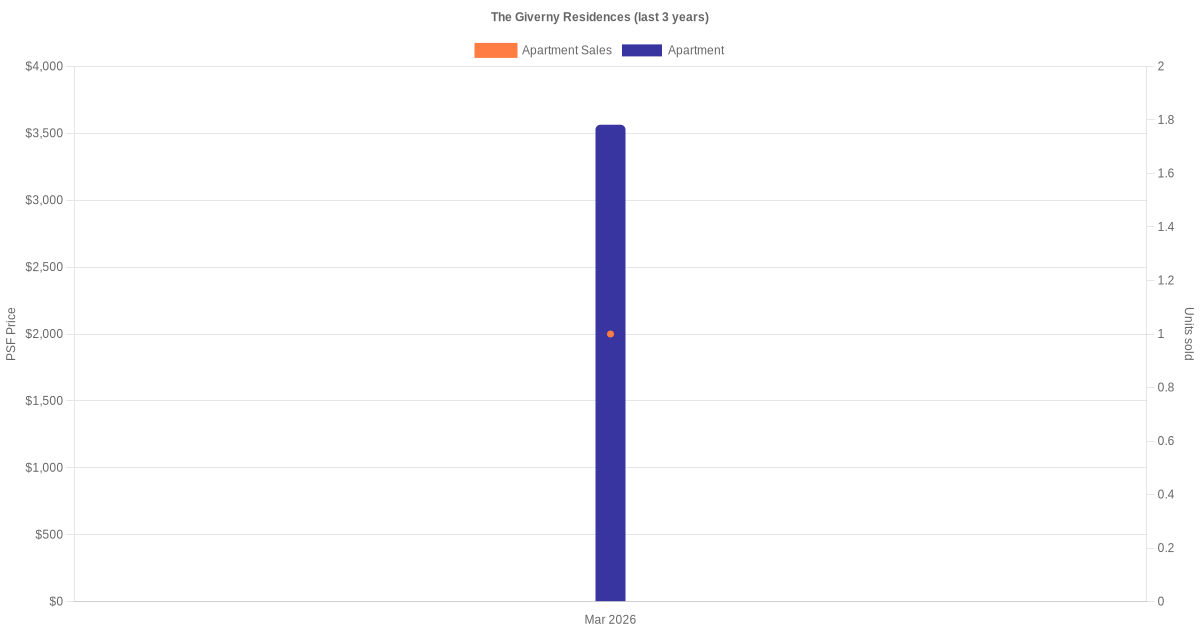 There were a total of 2 sales transactions for The Giverny Residences in the last 3 years, with the latest one recorded in Apr 2026. Disclaimer : our transactions data below does not include block numbers as the data is not available.