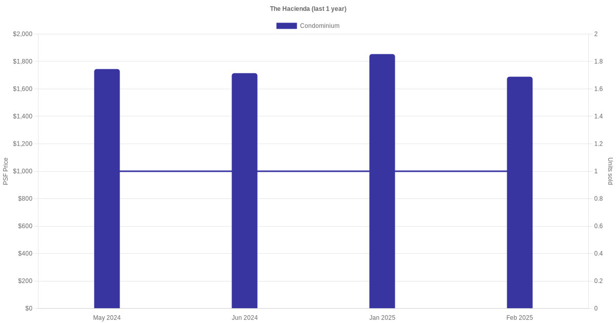 There were a total of 9 sales transactions for The Hacienda in the last 3 years, with the latest one recorded in May 2025. Disclaimer : our transactions data below does not include block numbers as the data is not available.