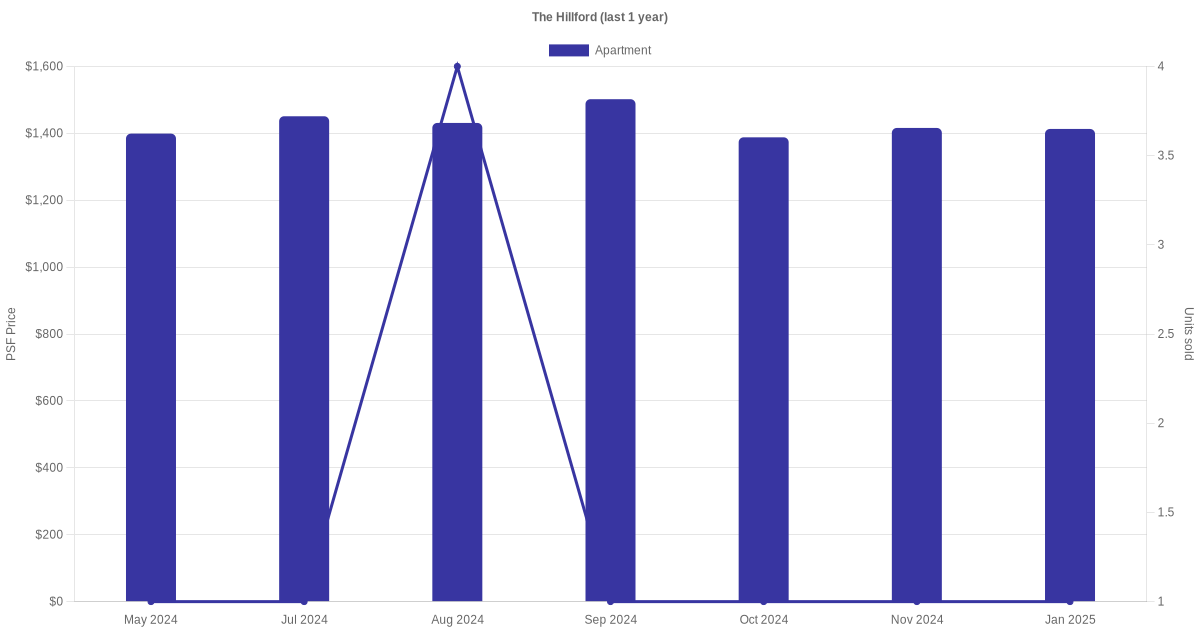 The graph below shows the average monthly transacted sale price for each of the apartment units for The Hillford in the last 3 years. This is based on the transactional data collated for The Hillford for the selected period.