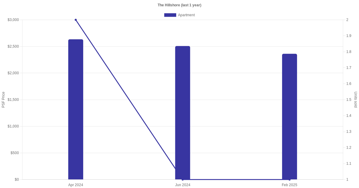 There were a total of 6 sales transactions for The Hillshore in the last 3 years, with the latest one recorded in Oct 2025. Disclaimer : our transactions data below does not include block numbers as the data is not available.