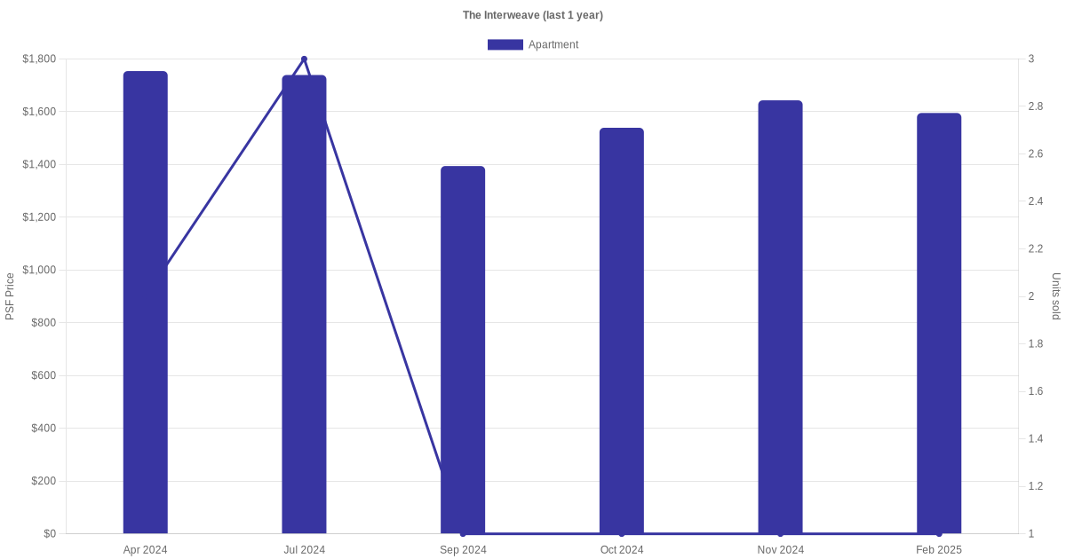 There were a total of 21 sales transactions for The Interweave in the last 3 years, with the latest one recorded in Nov 2025. Disclaimer : our transactions data below does not include block numbers as the data is not available.