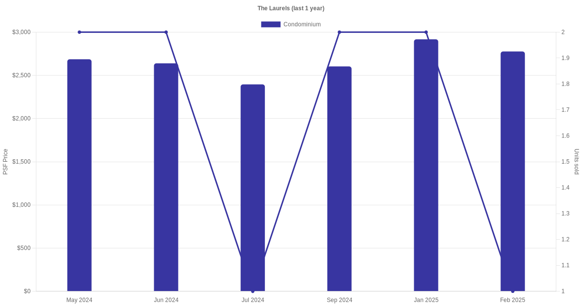 The graph below shows the average monthly transacted sale price for each of the condominium units for The Laurels in the last 3 years. This is based on the transactional data collated for The Laurels for the selected period.