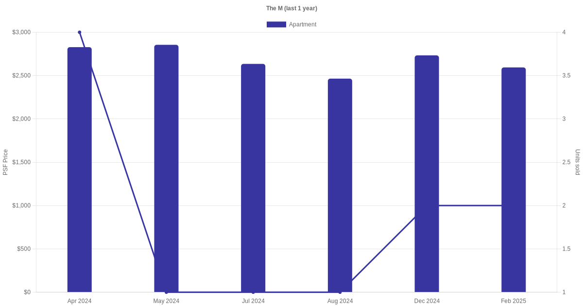 There were a total of 52 sales transactions for The M in the last 3 years, with the latest one recorded in Dec 2025. Disclaimer : our transactions data below does not include block numbers as the data is not available. If you would like to see a list of blocks / addresses associated with The M, please click here.