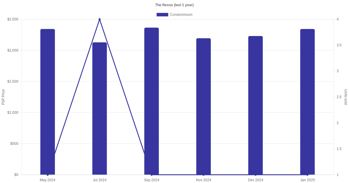 The graph below shows the average monthly transacted sale price for each of the condominium units for The Nexus in the last 3 years. This is based on the transactional data collated for The Nexus for the selected period.