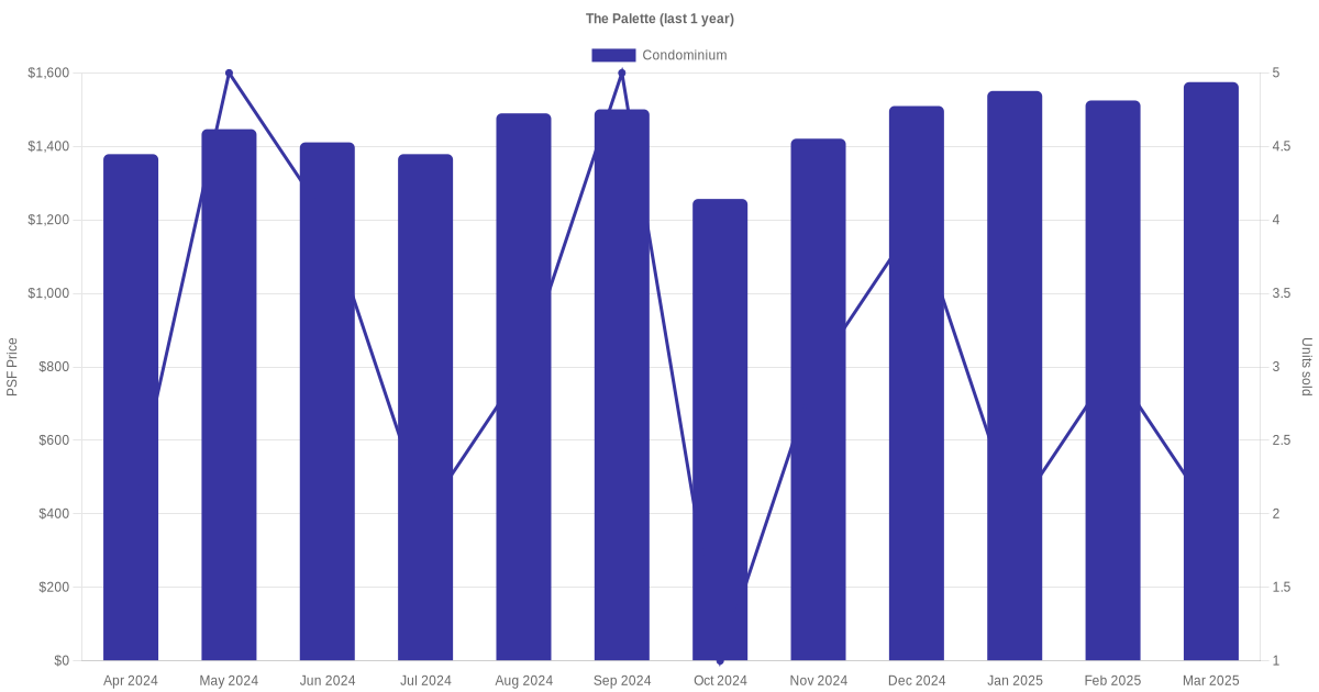There were a total of 108 sales transactions for The Palette in the last 3 years, with the latest one recorded in Dec 2025. Disclaimer : our transactions data below does not include block numbers as the data is not available. If you would like to see a list of blocks / addresses associated with The Palette, please click here.