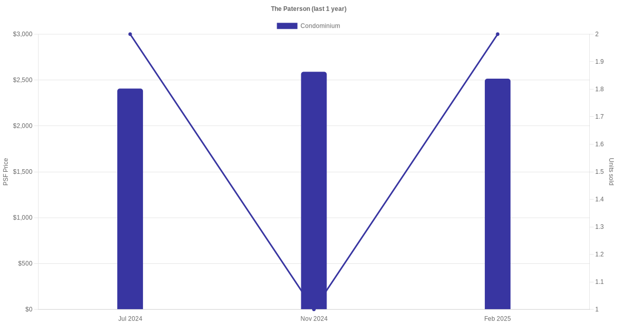 There were a total of 11 sales transactions for The Paterson in the last 3 years, with the latest one recorded in Feb 2025. Disclaimer : our transactions data below does not include block numbers as the data is not available.