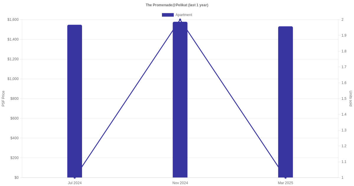 The graph below shows the average monthly transacted sale price for each of the apartment units for The Promenade@Pelikat in the last 3 years. This is based on the transactional data collated for The Promenade@Pelikat for the selected period.