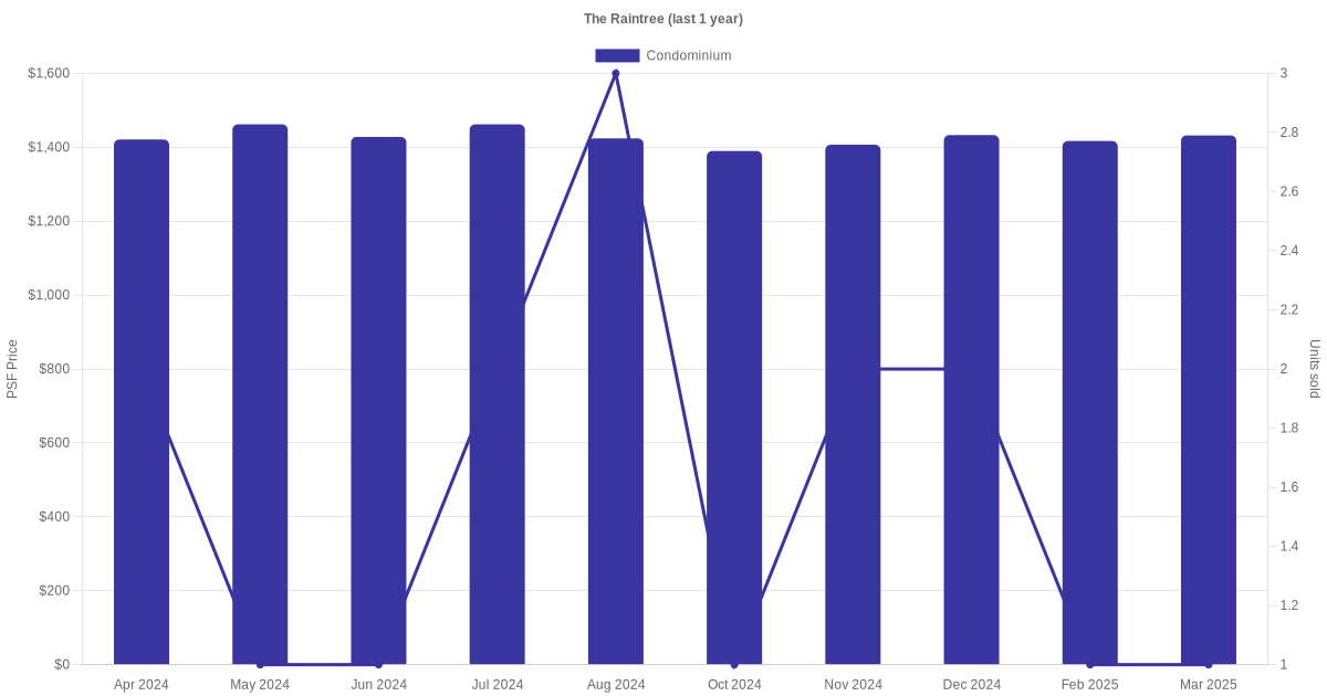 The graph below shows the average monthly transacted sale price for each of the condominium units for The Raintree in the last 3 years. This is based on the transactional data collated for The Raintree for the selected period.