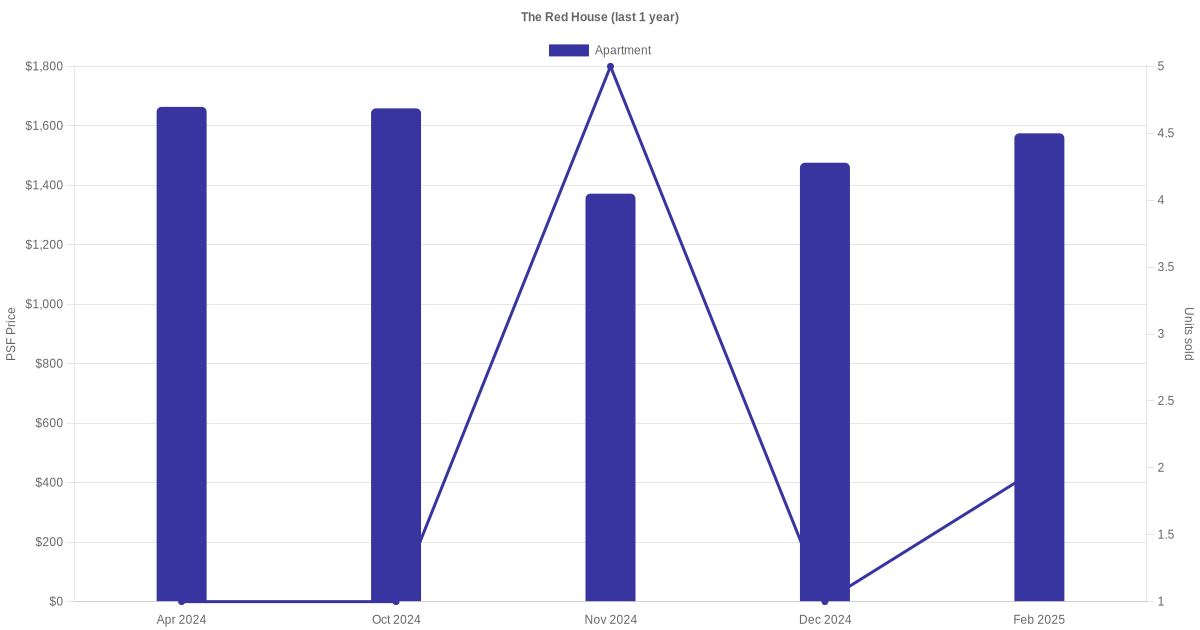 The graph below shows the average monthly transacted sale price for each of the apartment units for The Red House in the last 3 years. This is based on the transactional data collated for The Red House for the selected period.