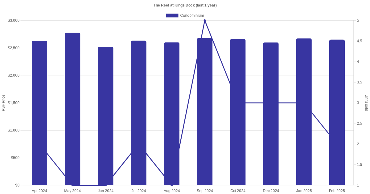 There were a total of 69 sales transactions for The Reef at King's Dock in the last 3 years, with the latest one recorded in Dec 2025. Disclaimer : our transactions data below does not include block numbers as the data is not available. If you would like to see a list of blocks / addresses associated with The Reef at King's Dock, please click here.