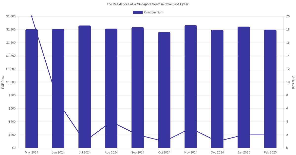 There were a total of 107 sales transactions for The Residences at W Singapore Sentosa Cove in the last 3 years, with the latest one recorded in Dec 2025. Disclaimer : our transactions data below does not include block numbers as the data is not available. If you would like to see a list of blocks / addresses associated with The Residences at W Singapore Sentosa Cove, please click here.