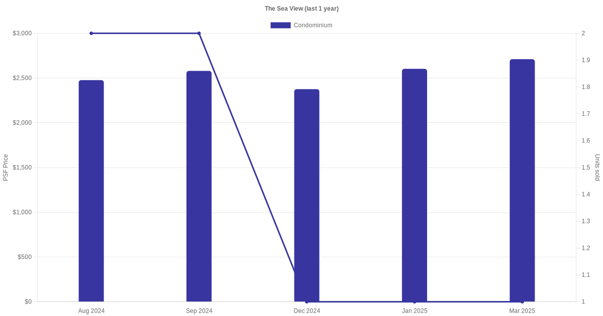 There were a total of 31 sales transactions for The Sea View in the last 3 years, with the latest one recorded in Oct 2025. Disclaimer : our transactions data below does not include block numbers as the data is not available.