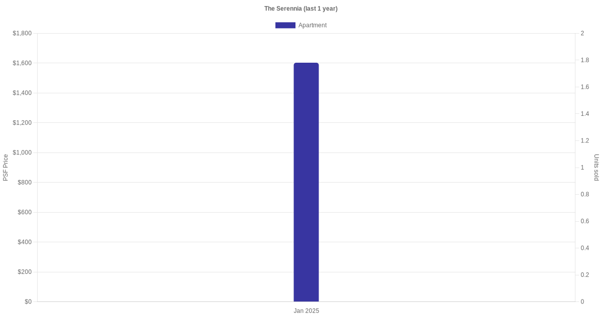 There were a total of 1 sales transactions for The Serennia in the last 3 years, with the latest one recorded in Jan 2025. Disclaimer : our transactions data below does not include block numbers as the data is not available. If you would like to see a list of blocks / addresses associated with The Serennia, please click here.