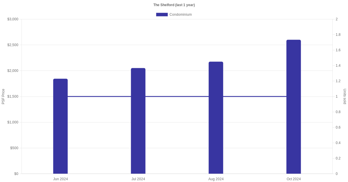 The graph below shows the average monthly transacted sale price for each of the condominium units for The Shelford in the last 3 years. This is based on the transactional data collated for The Shelford for the selected period.