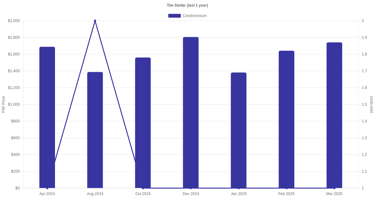 There were a total of 11 sales transactions for The Stellar in the last 3 years, with the latest one recorded in Mar 2025. Disclaimer : our transactions data below does not include block numbers as the data is not available.