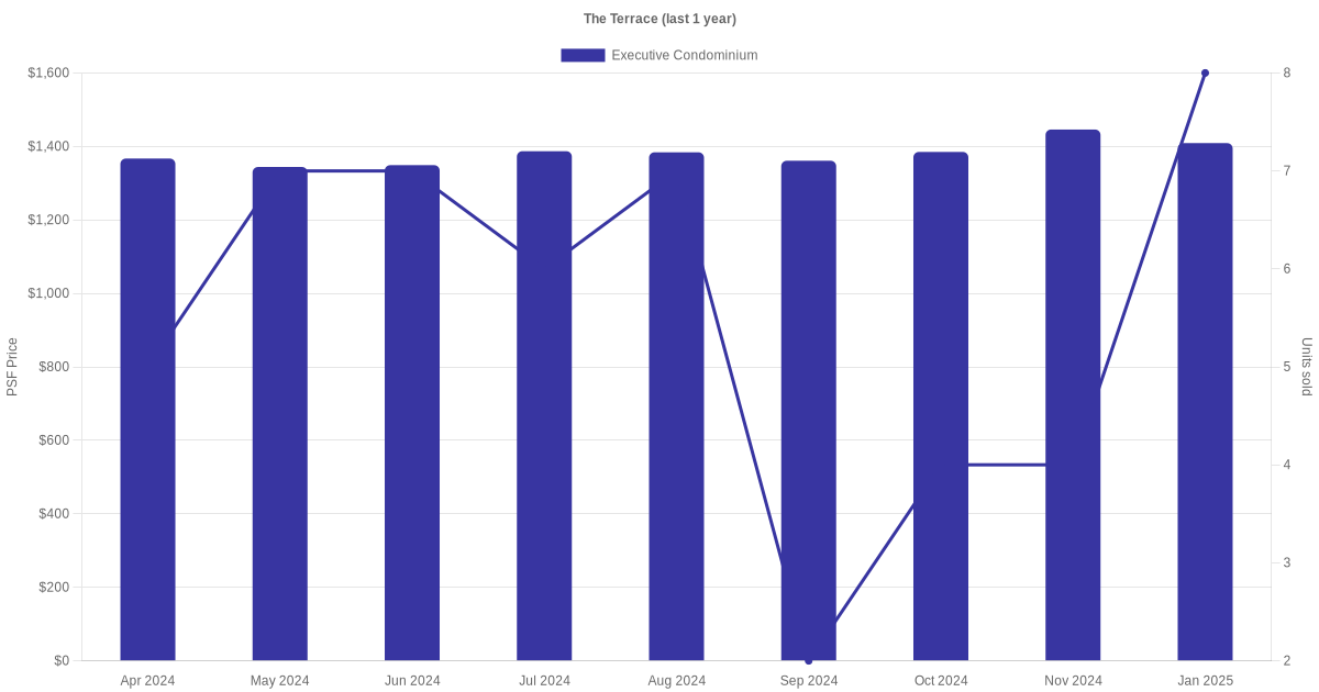 The graph below shows the average monthly transacted sale price for each of the executive condominium units for The Terrace in the last 3 years. This is based on the transactional data collated for The Terrace for the selected period.
