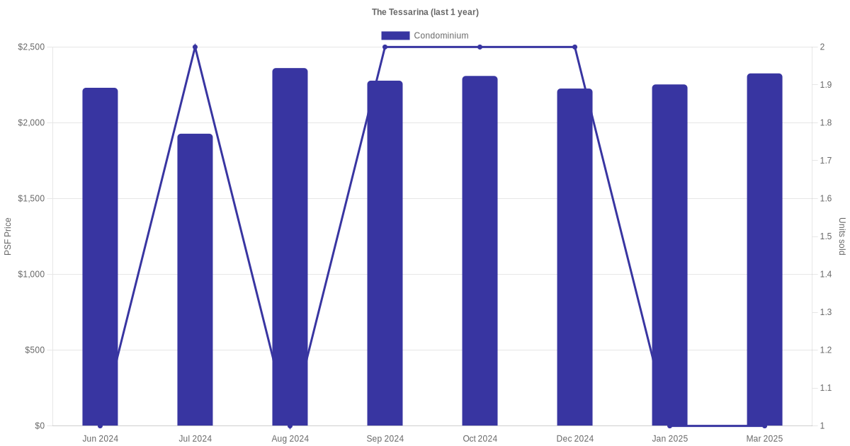 There were a total of 35 sales transactions for The Tessarina in the last 3 years, with the latest one recorded in Oct 2025. Disclaimer : our transactions data below does not include block numbers as the data is not available.