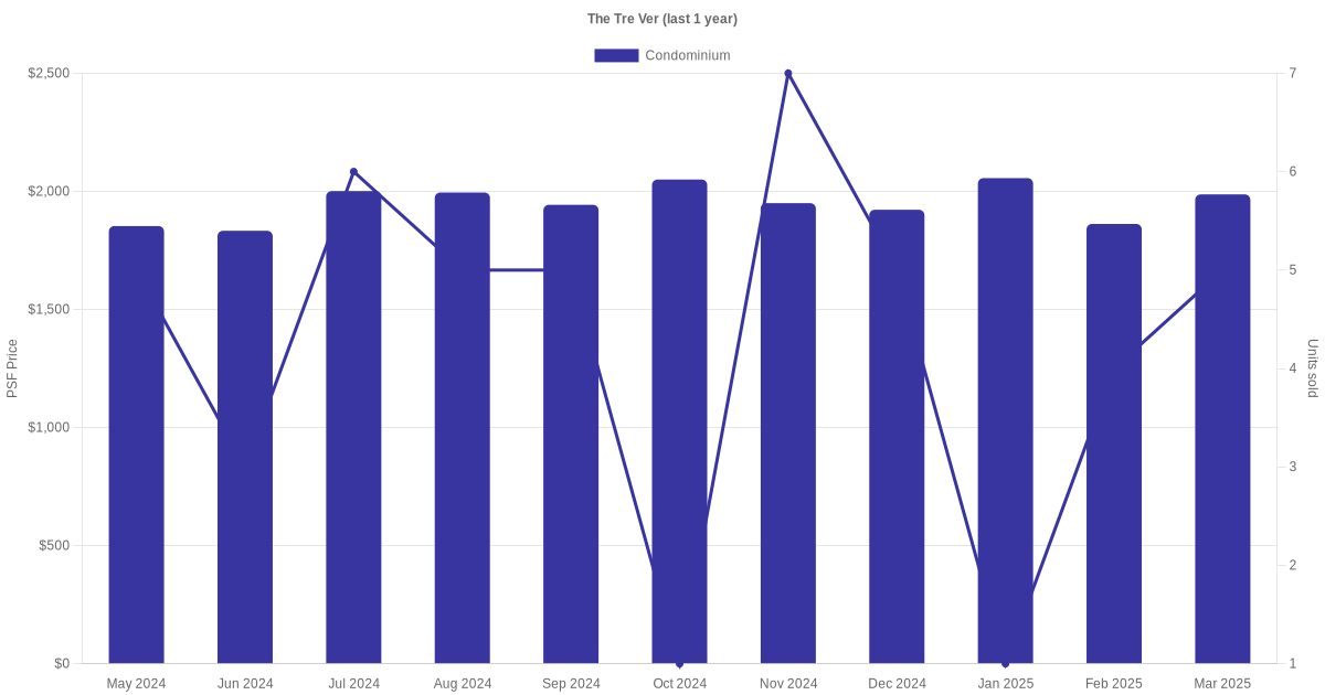 The graph below shows the average monthly transacted sale price for each of the condominium units for The Tre Ver in the last 3 years. This is based on the transactional data collated for The Tre Ver for the selected period.