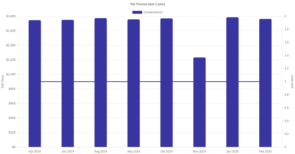There were a total of 16 sales transactions for The Trevose in the last 3 years, with the latest one recorded in Dec 2025. Disclaimer : our transactions data below does not include block numbers as the data is not available.