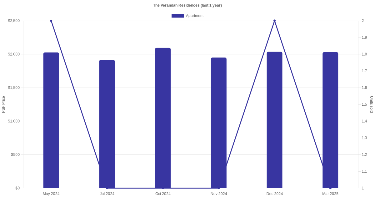 There were a total of 23 sales transactions for The Verandah Residences in the last 3 years, with the latest one recorded in Oct 2025. Disclaimer : our transactions data below does not include block numbers as the data is not available.