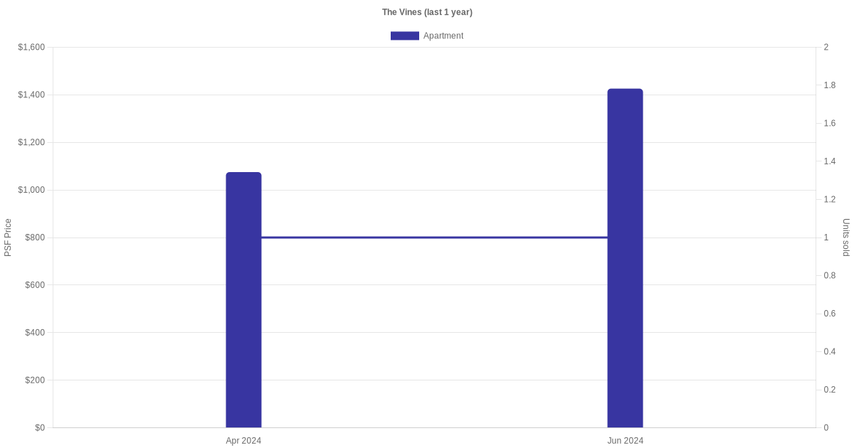There were a total of 4 sales transactions for The Vines in the last 3 years, with the latest one recorded in Jun 2024. Disclaimer : our transactions data below does not include block numbers as the data is not available.