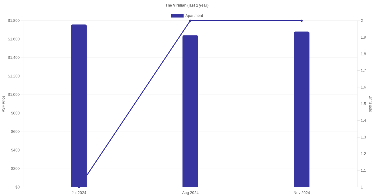 The graph below shows the average monthly transacted sale price for each of the apartment units for The Viridian in the last 3 years. This is based on the transactional data collated for The Viridian for the selected period.