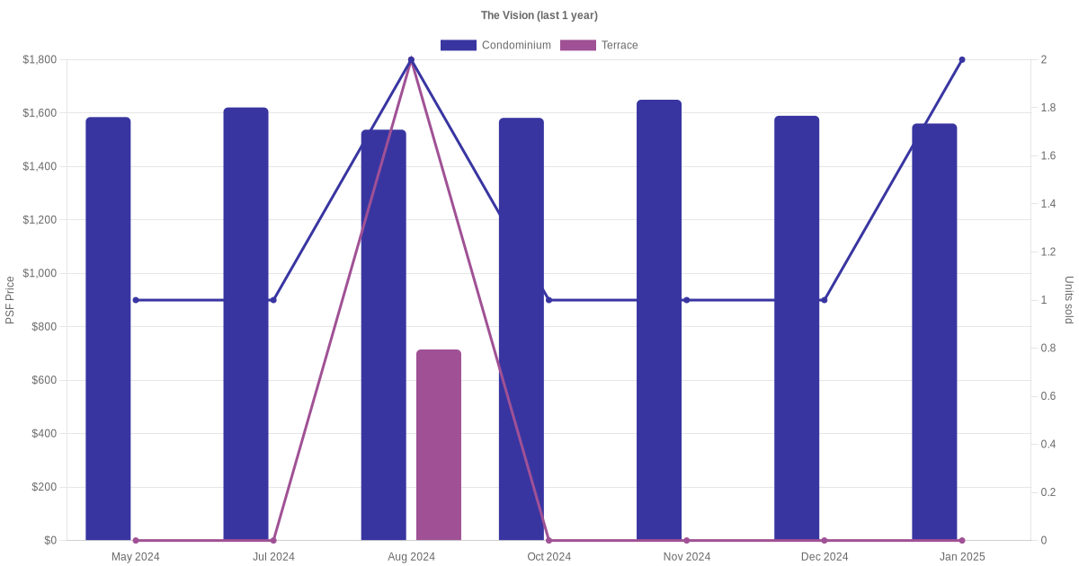 The graph below shows the average monthly transacted sale price for each of the condominium and terrace units for The Vision in the last 3 years. This is based on the transactional data collated for The Vision for the selected period.