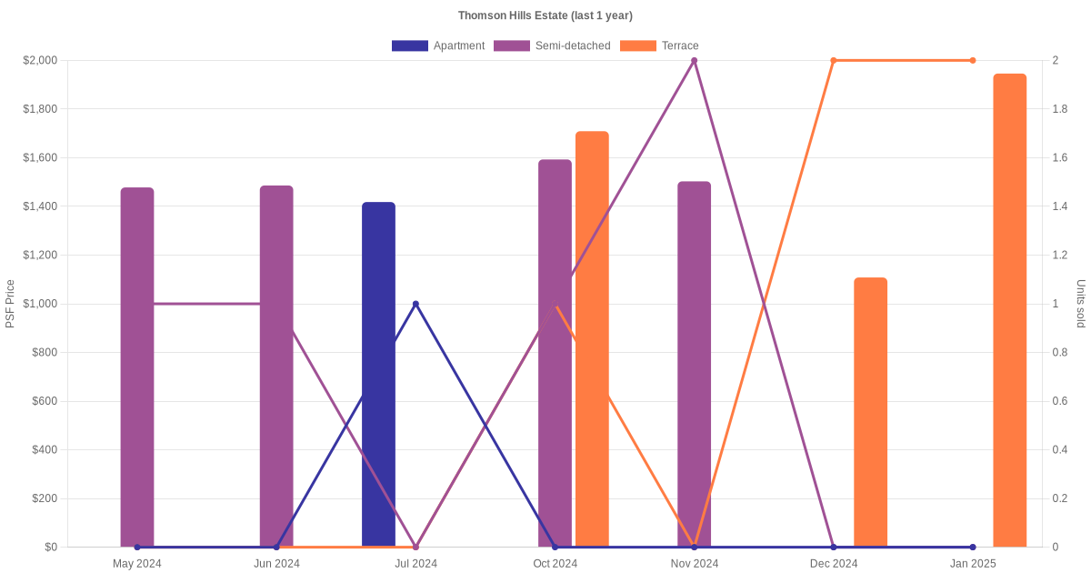 The graph below shows the average monthly transacted sale price for each of the apartment, semi-detached and terrace units for Thomson Hills Estate in the last 3 years. This is based on the transactional data collated for Thomson Hills Estate for the selected period.